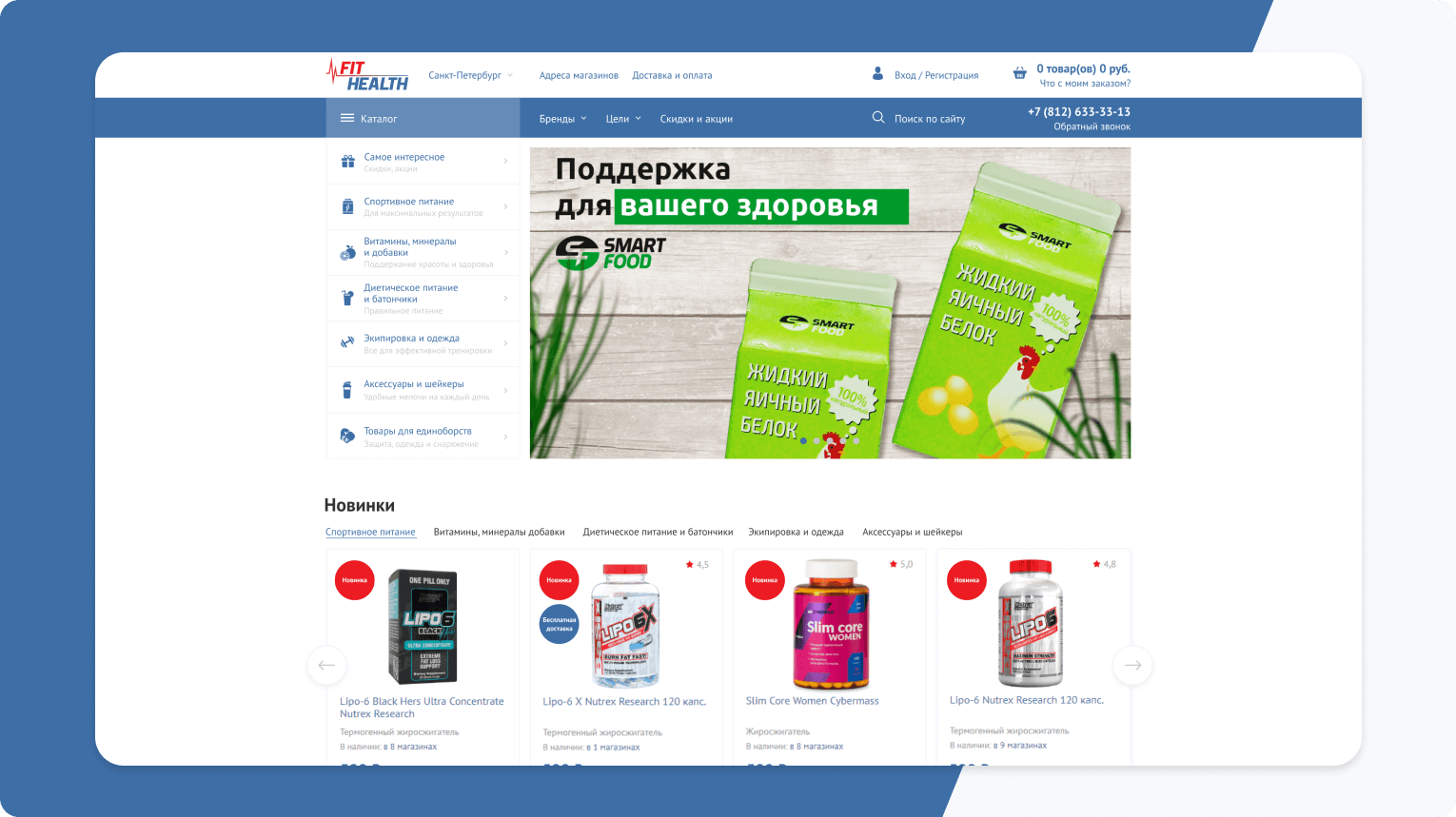 Клиент: Магазин спортивного и диетического питания, витаминов и добавок для здоровья. Работает в Санкт-Петербурге, доставка по всей России.